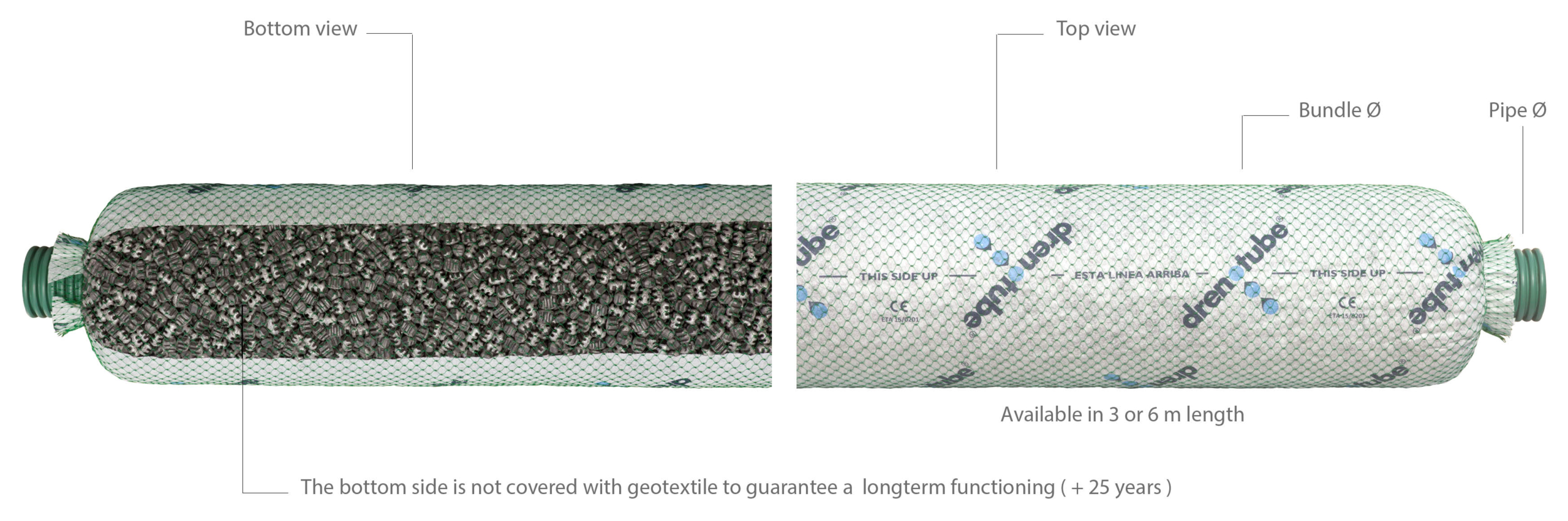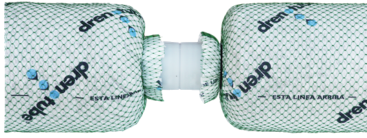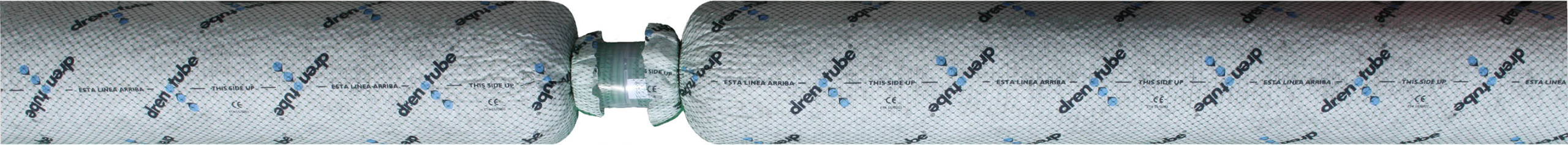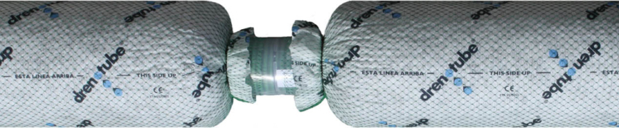 drenotube® is a geocomposite that offers solutions for soil drainage. Preassembled drainage segments consist of a double wall slotted corrugated pipe surrounded by a geosynthetic aggregate enclosed in a high strength polyethylene netting that is clamped to both ends of the pipe. Includes a fabric geotextile filter in between the netting and aggregate.